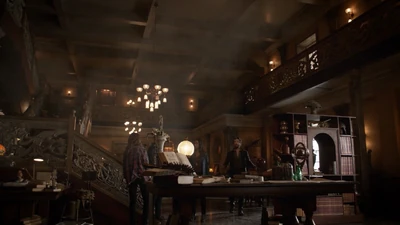 The 355 Agency appears to be one small office. It is deeply underwhelming. The person there, Jake Wells, asks if he can help them. After a moment, he recognizes Crane as "Captain Brownbeard" from Sleepy Hollow, and digs out a file of Darknet sites with photos of Crane. Jake explains that their job is to catalogue everything from the fringes. He takes a selfie of himself with Crane, just as they hear an explosion from the next room. As they enter, Jake complains that Alex said she wouldn't set things off anymore. A woman, Alex Norwood, explains that she put the new Mayan artifact in the microwave to test it. The room is much more to Crane's liking, it is large and palladium and contains all of their files and artifacts. Jake explains that he does news and information while Alex does artifacts and gadgets. Crane launches into the room and finds a log with Washington's seal, and a code written in Benjamin Franklin's alphabet. He claims that he learned them when he apprenticed as Benjamin's typesetter, and then hastily corrects that he learned it from study. Crane continues going through the logs and finds a reference to the demon; it was summoned in 1865 by a Confederate occultist named Booth. Booth raised the beast to kill the president. Diana realizes that the occultist was John Wilkes Booth.