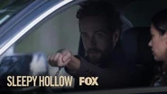 Elsewhere, the demon approaches a souvenir seller and kills him. As the police investigate the crime scene, Diana has brought Crane along, cuffed inside her vehicle. Crane tries to call Jenny, and gets her voice mail, and leaves a message that he's left Sleepy Hollow and has found new allies. Diana returns as Crane checks the handcuff that Diana used to fasten him to the steering wheel. She says that the seller's body is in the same condition as Eric's, he had a puncture wound at the base of his skull. She agrees to a temporary alliance with Crane, not a partnership, and removes the handcuff. She then accesses an archive for a Federal agency, 355, known as "The Vault." Crane recalls a reference to it on the letter that Ezra gave him from Washington. He says that they must go there.